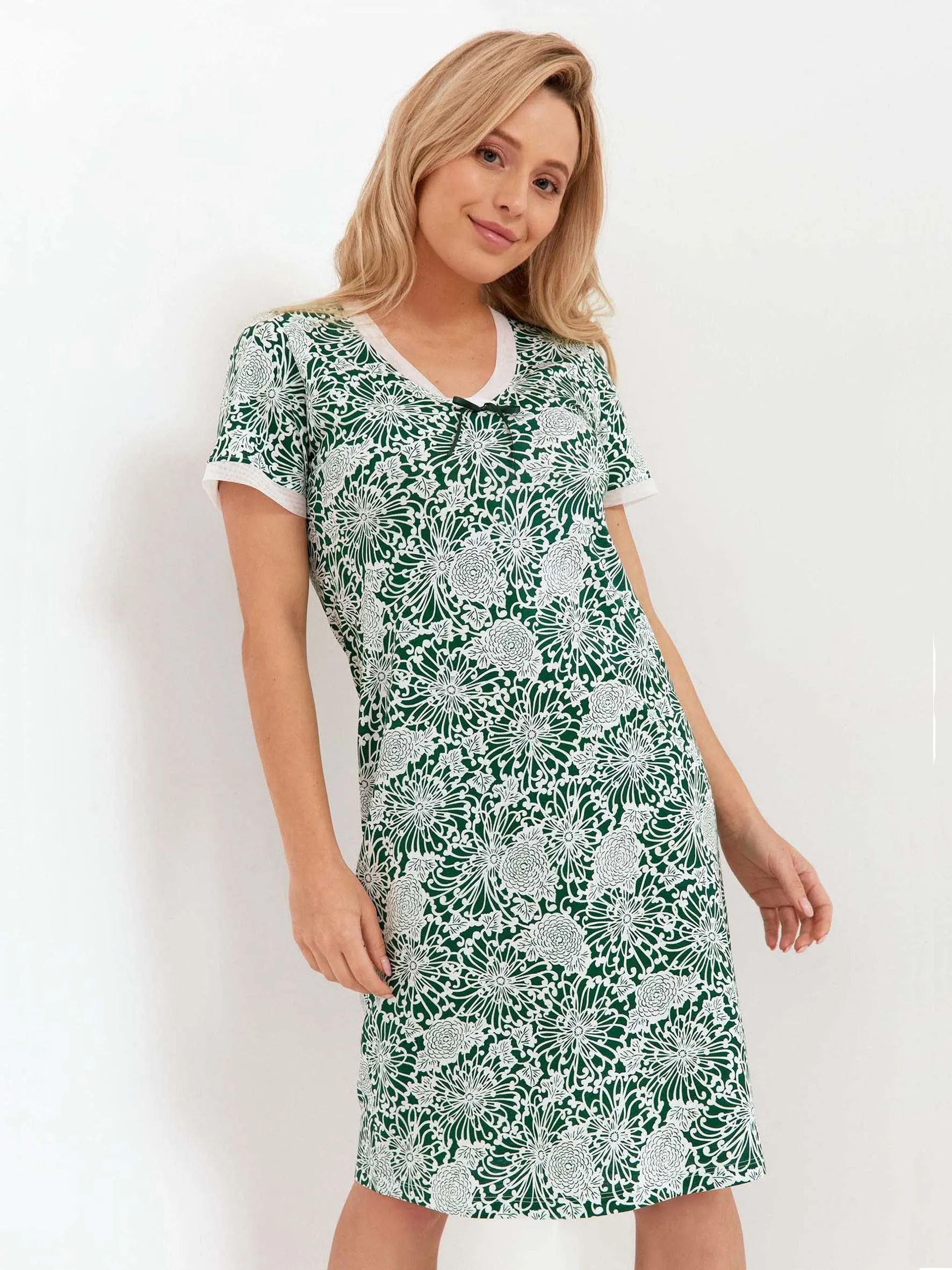 Tabela rozmiarówObwód biustuTaliaObwód bioder S84-88 cm64-74 cm84-90 cm M88-92 cm67-77 cm90-96 cm L92-96 cm70-80 cm 96-102 cm XL96-100 cm73-83 cm102-108 cm Krój: Regular fit Dekolt półokrągły Delikatna kolorystyka Długość przed kolano Hipoalergiczna Kobieca stylistyka Luźny, komfortowy krój Pakowany w woreczek foliowy Prać w 30 stop.
